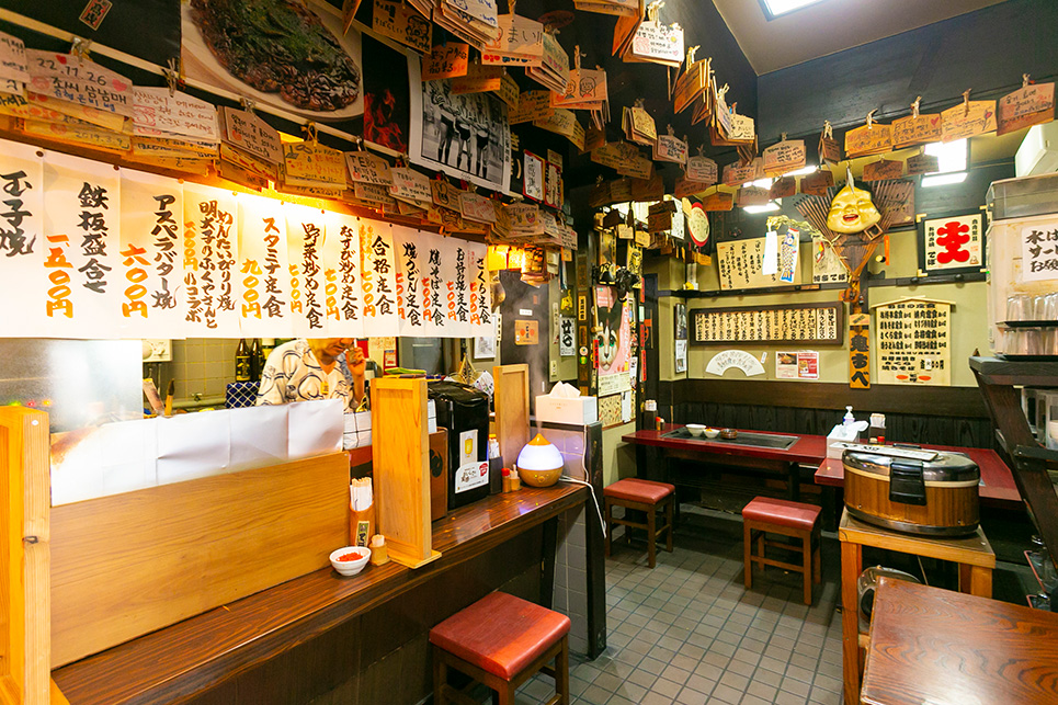 大阪風の出汁を加えて作る生地、創業時から継ぎ足して使っている 特製ソースが特徴。店内には外国人ファンのメッセージ絵馬がズラリ。